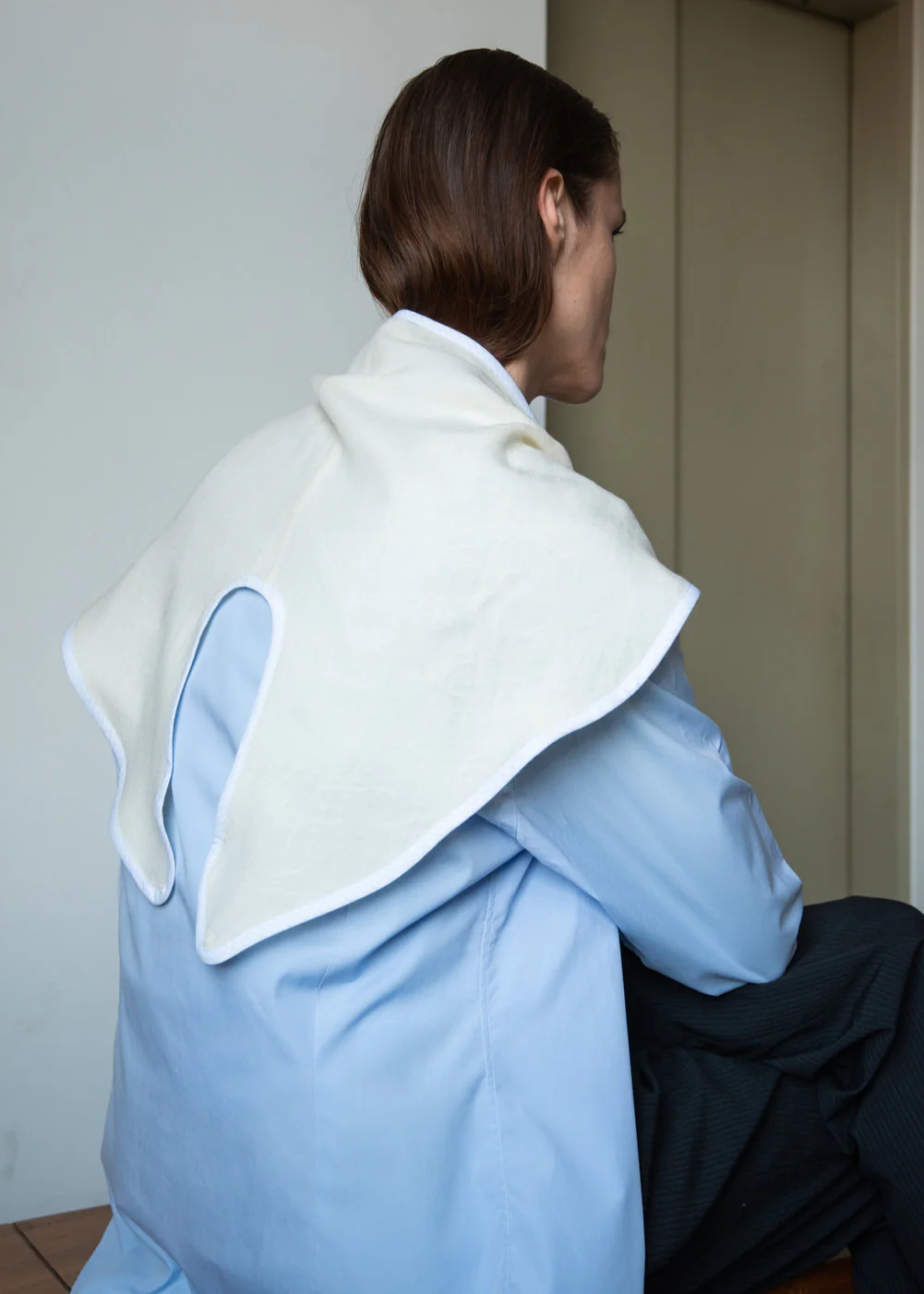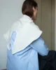 Niezwykle oryginalna „falista” chusta wykonana z miękkiej  i delikatnej wełny (deadstock), z ukośnymi szwami. Wyprodukowany w limitowanej serii zaledwie 20 sztuk, jest wszechstronnym dodatkiem, który oferuje zarówno ciepło, jak i nieskończone możliwości stylizacji.